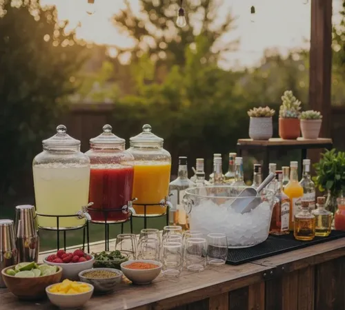 Fresh Finishing Touches: A spread of fresh fruit garnishes (lemons, limes, and cherries) plus salt/sugar rimming options as needed.